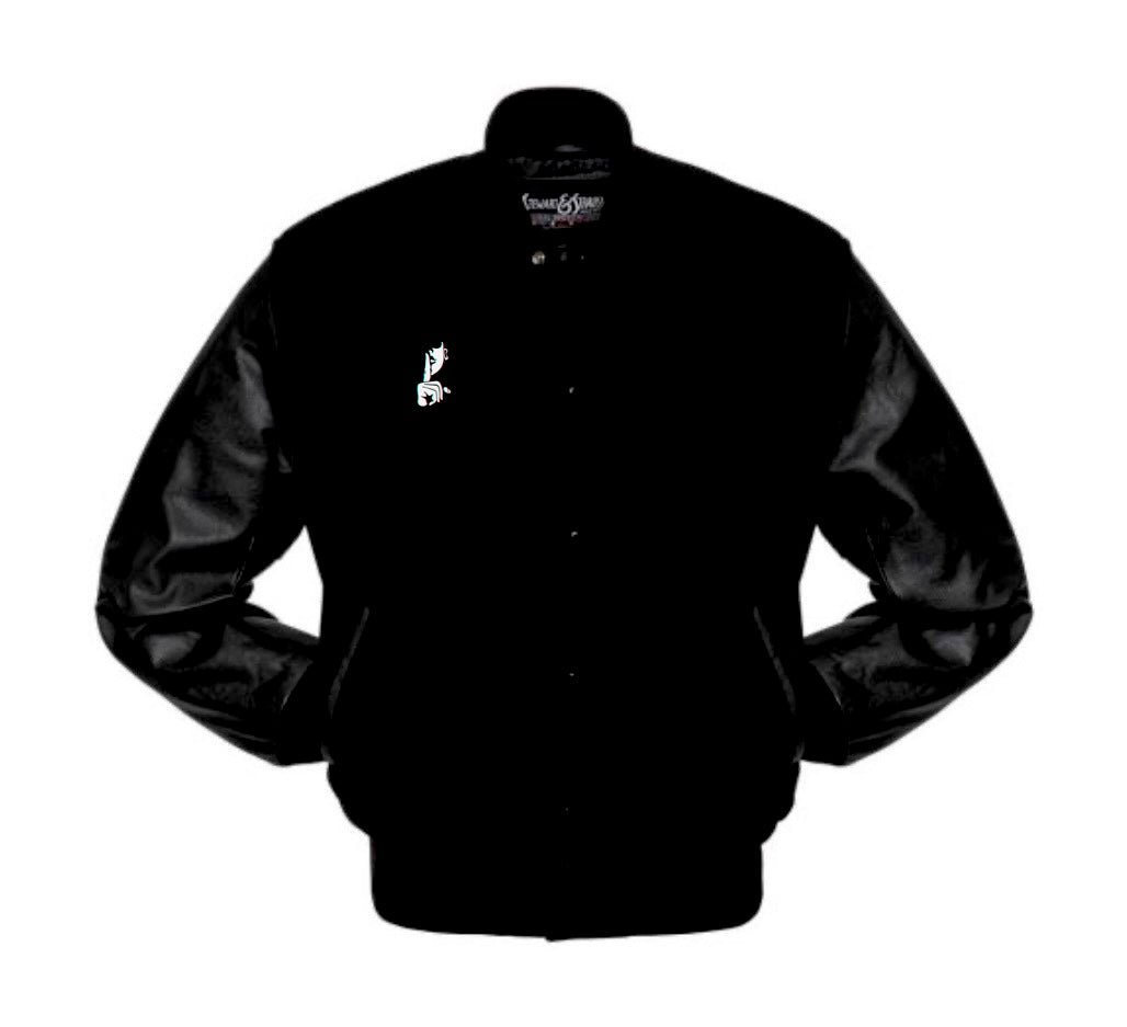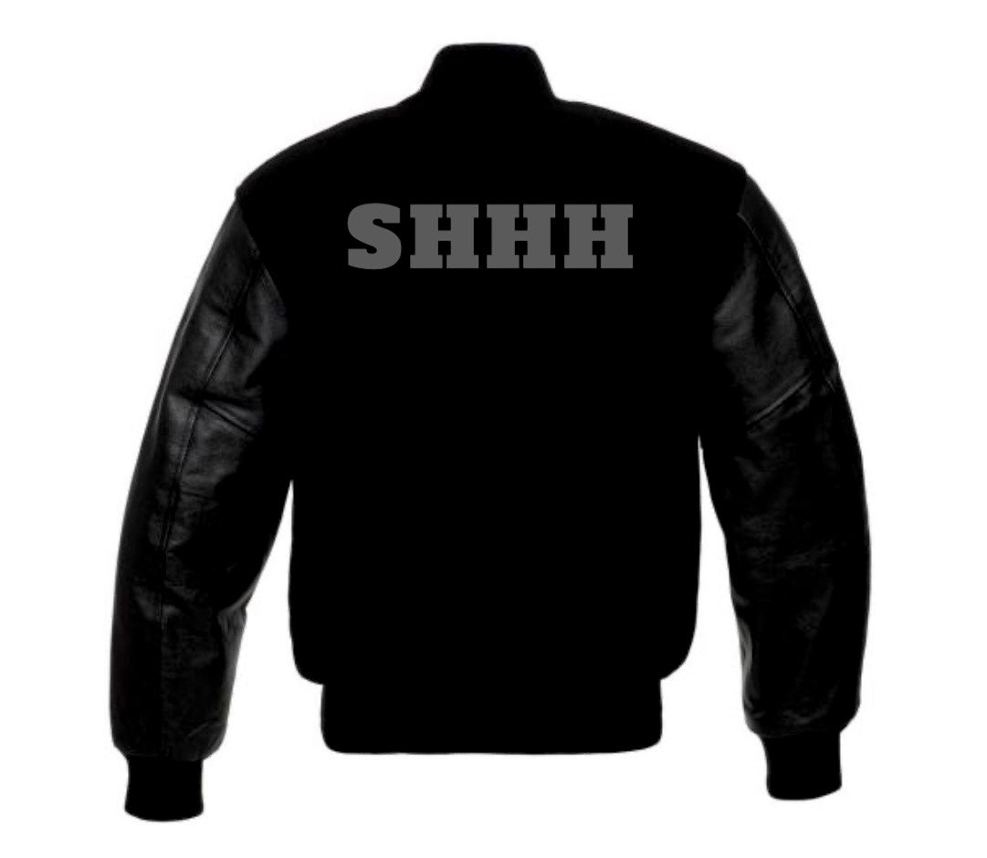 SHHH logo letterman jacket. Made of gently blended wool and polycotton fabric. Unisex